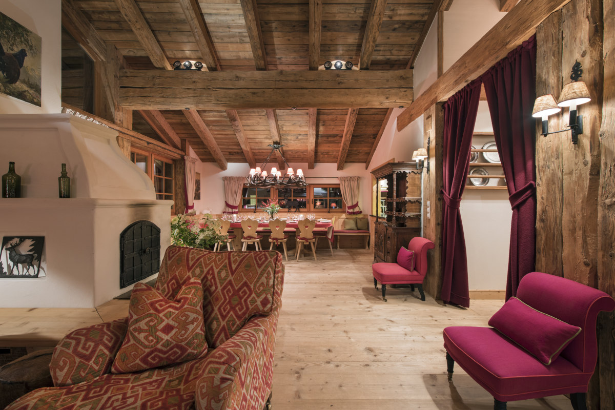 In the centre of the living space is a traditional wood-burning Stübe oven with a wooden bench surrounding it.
