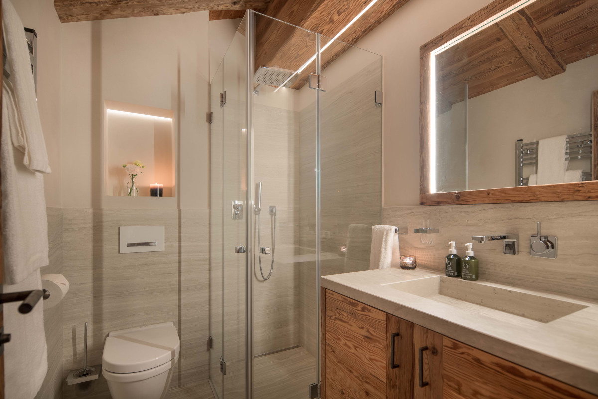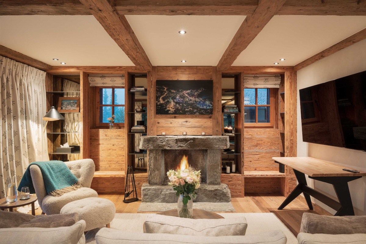 The living area centres a delightful fireplace, framed by windows looking out over the local mountainscape. A large flat-screen TV and Sonos entertainment system and a cosy atmosphere offer guests a space to unwind. A WC is discretely positioned in the corner of the room for convenience, accessible from the main entrance hall on this level.