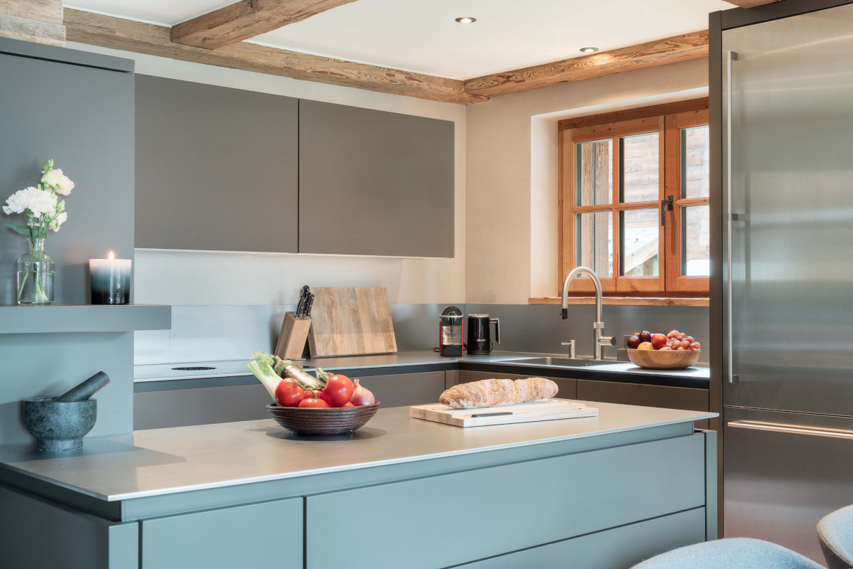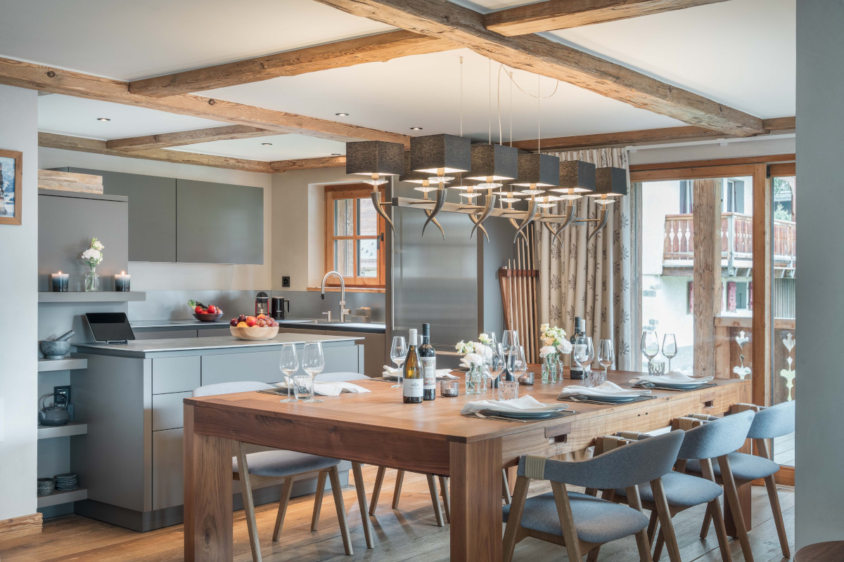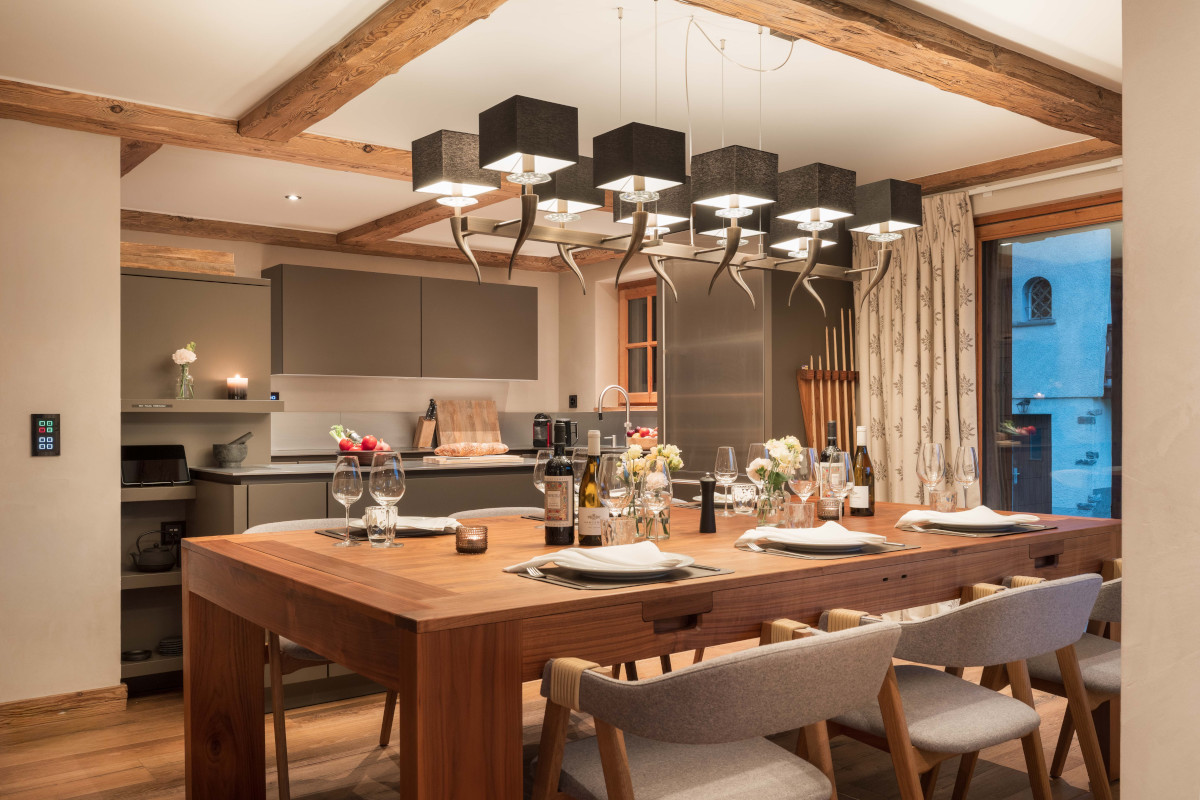 Stairs lead you to the beautiful living area on the first floor. Contemporary design features blend seamlessly with traditional features, giving the space a stylish yet homely feel. A modern kitchen is complemented by a large dining table that can sit six comfortably. This table can be transformed into a full-sized pool table for after-dinner entertainment. A spacious south-facing balcony is accessible from the kitchen and living areas, providing extra outdoor seating and views across the village and out to the mountains, perfect for catching the last of the evening sun.