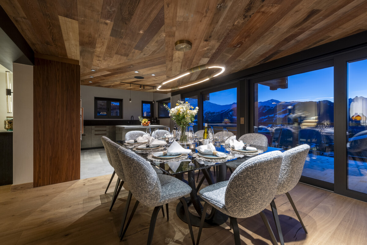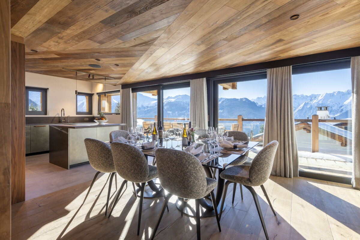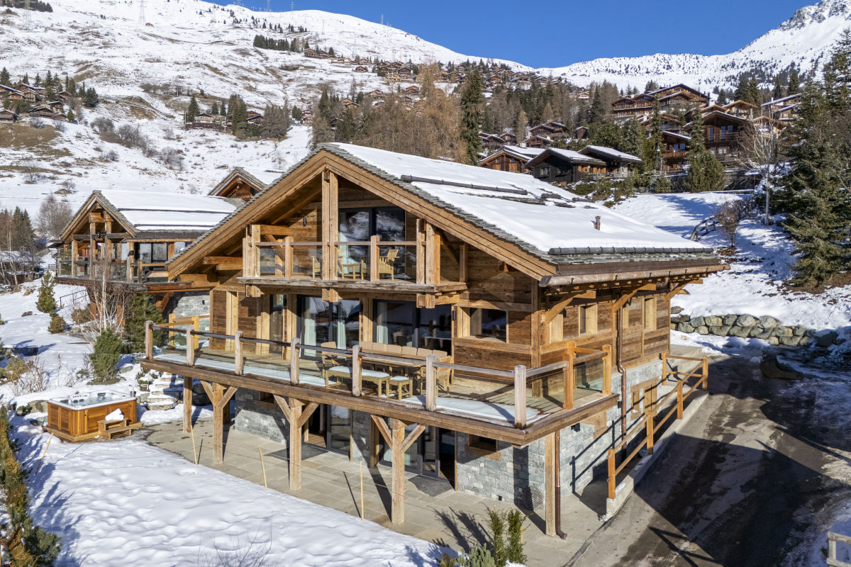 A balcony with plenty of seating and an outdoor dining table extends around two sides of the chalet, and a paved terrace runs around the structure at garden level. From both inside and outside the chalet, the views over Verbier and the Val de Bagnes to the high mountains beyond are incredible.