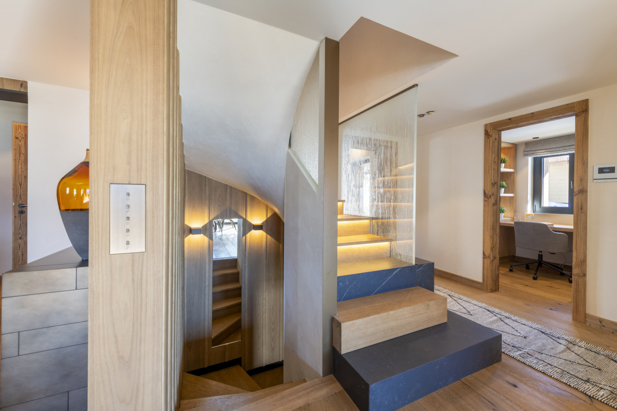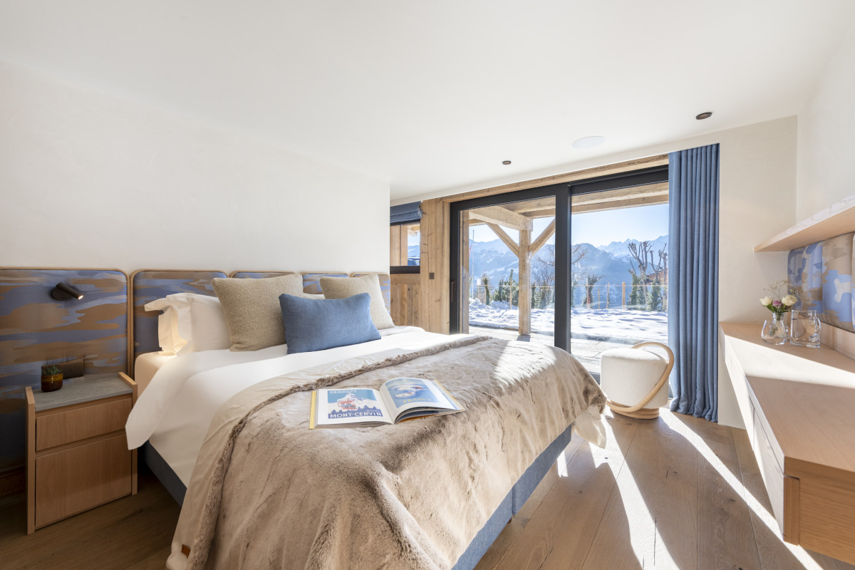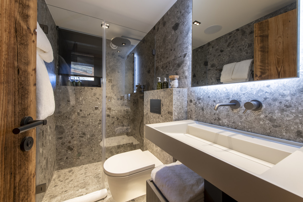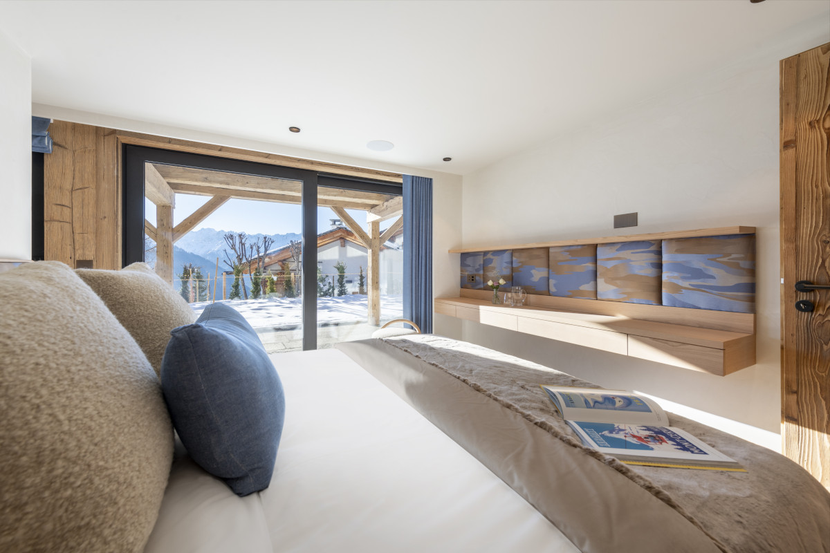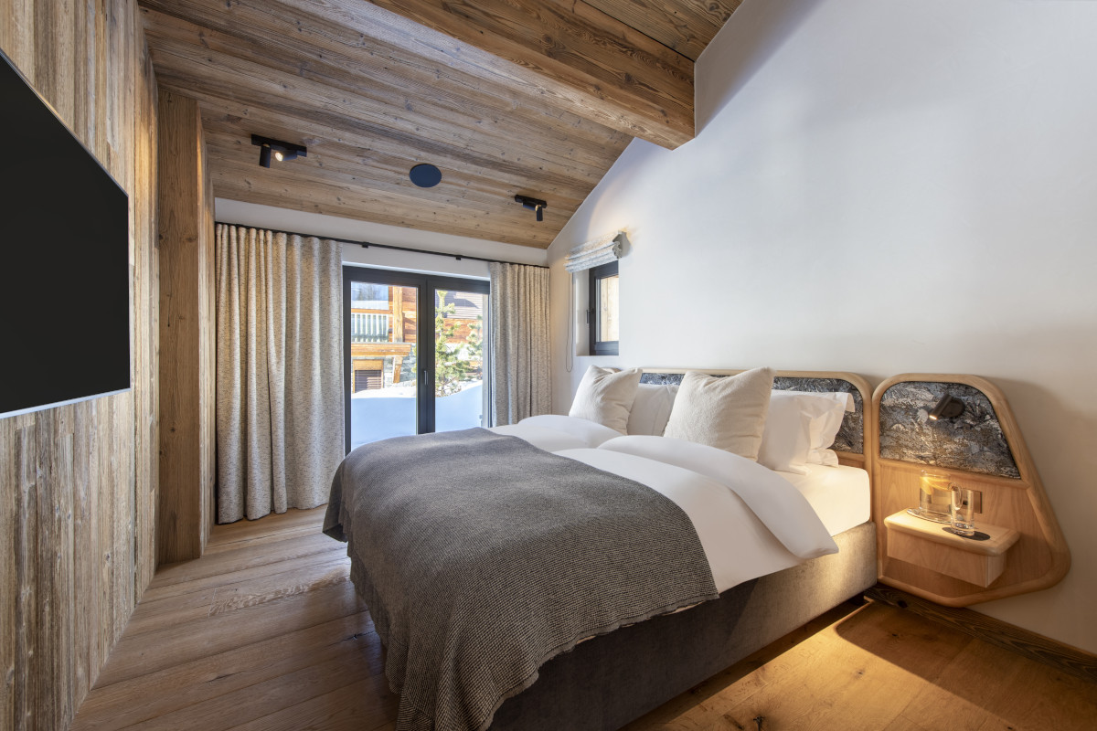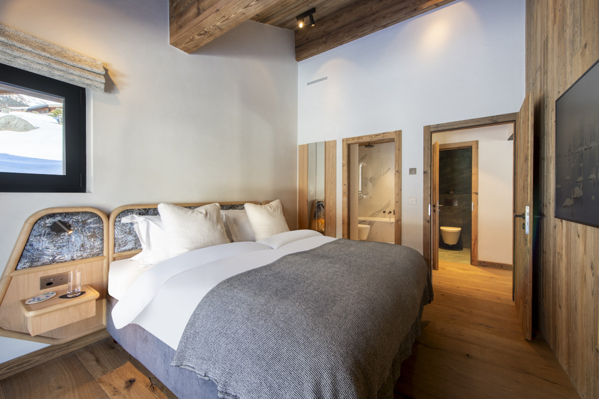 The chalet has five bedrooms spread over all three floors. The top floor is entirely taken up by the master suite, which has a super-king sized bed, a private balcony, seating area, dressing room, and a bathroom with a freestanding oval tub, shower and his and hers sinks.