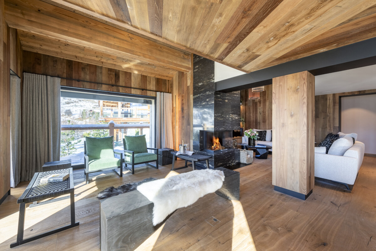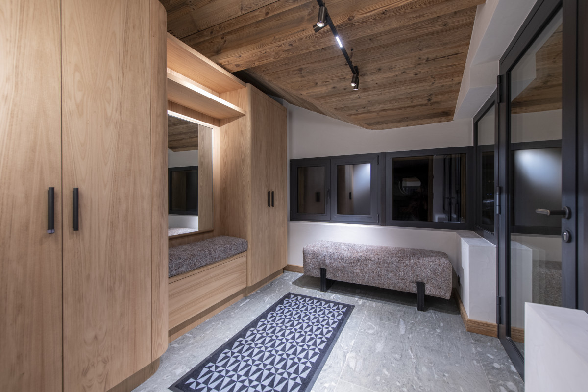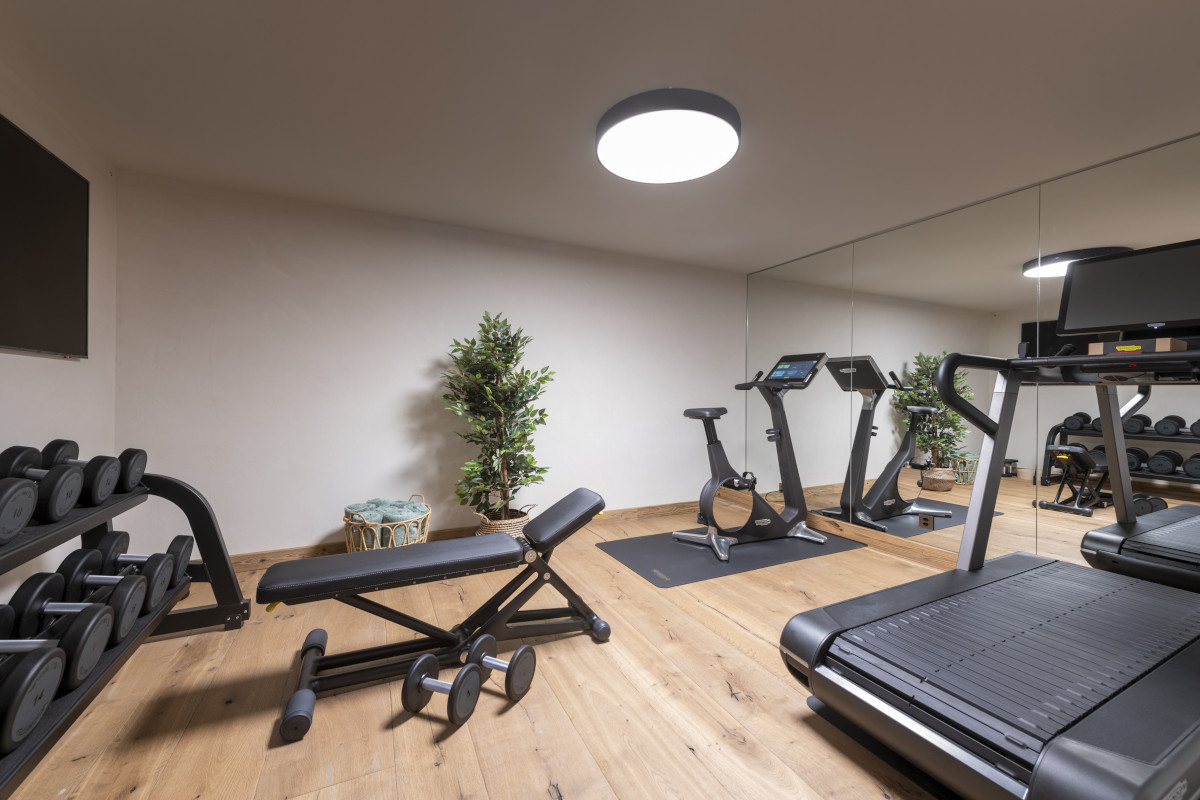 The lower floor also has a ski room with boot dryers and plenty of storage for skis and outdoor gear, and a well-equipped fitness room. There is a second entrance on this level, and there is an outdoor hot tub and a fire pit on the terrace in front of the chalet.