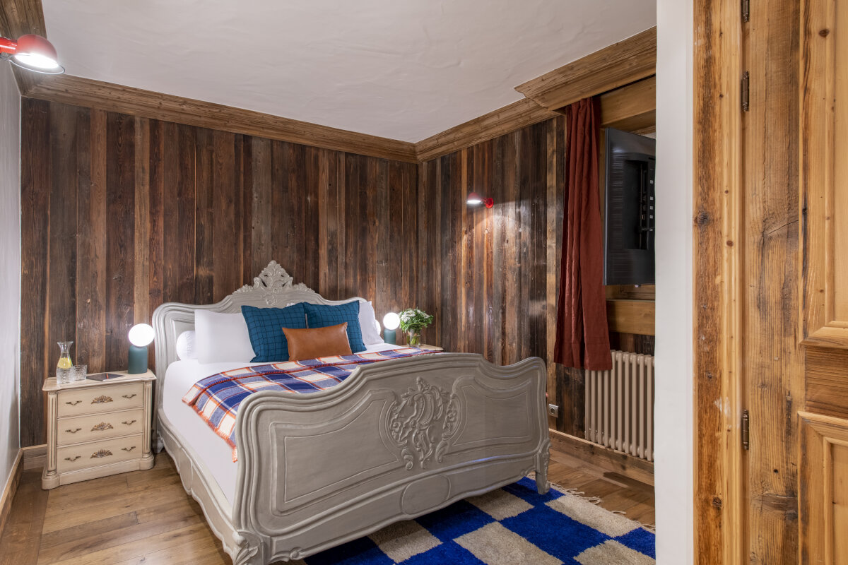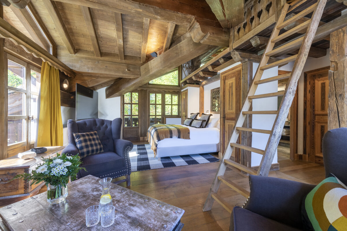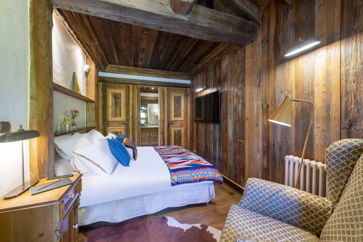 The top floor is taken up by the large master bedroom suite, decorated in luxurious fashion with beautiful warm woods and stone features. There is a fireplace, TV, dressing area, en suite bathroom with a spa bath, and no less than three balconies to take in the mountainscapes.
