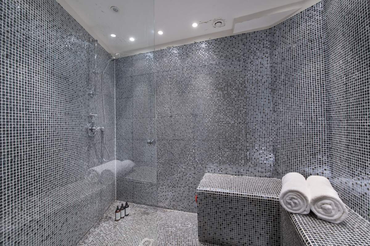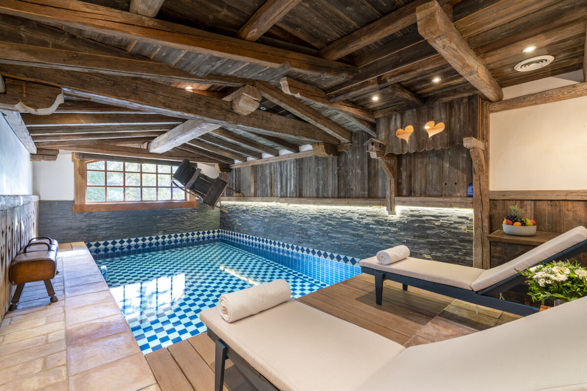 The chalet’s relaxation and entertainment spaces are on the ground floor. There is an indoor swimming pool to stretch out and do a few laps at the end of a day’s skiing, a hammam, a shower room, and a cinema room with a state of the art sound system. There is a fifth double bedroom on this floor, with an en suite bathroom, dressing room, and an office next door.