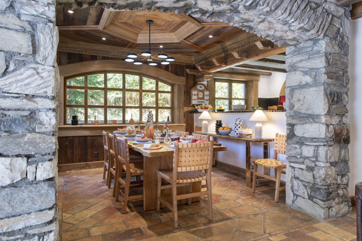 The main entrance on the first floor opens directly into the luxurious living space. The focus of the living area is a gorgeous stone fireplace surrounded with rustic stone and wood. In front of the fireplace are inviting sofas with plump cushions, and a second sitting room with an L-shaped couch is a cosy place to snuggle up and read a book in comfort. High ceilings and large windows allow the space to be flooded with light and guests to enjoy the majestic mountain views.