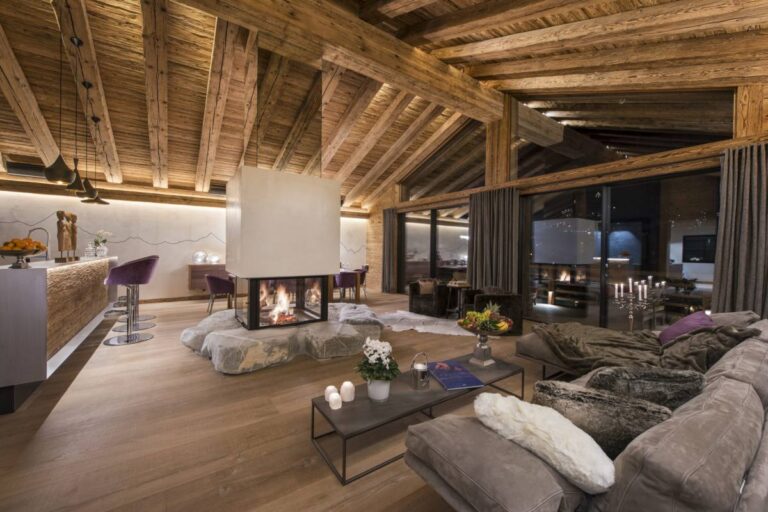 Ultra-modern and effortlessly sophisticated, the interiors seamlessly combine traditional alpine features, such as exposed wood beams and floors, with contemporary artwork and sumptuously soft furnishings.