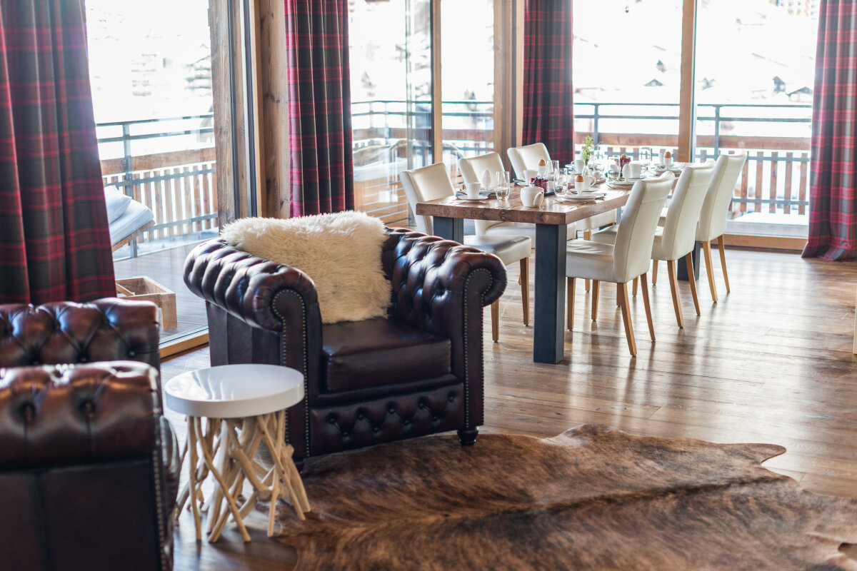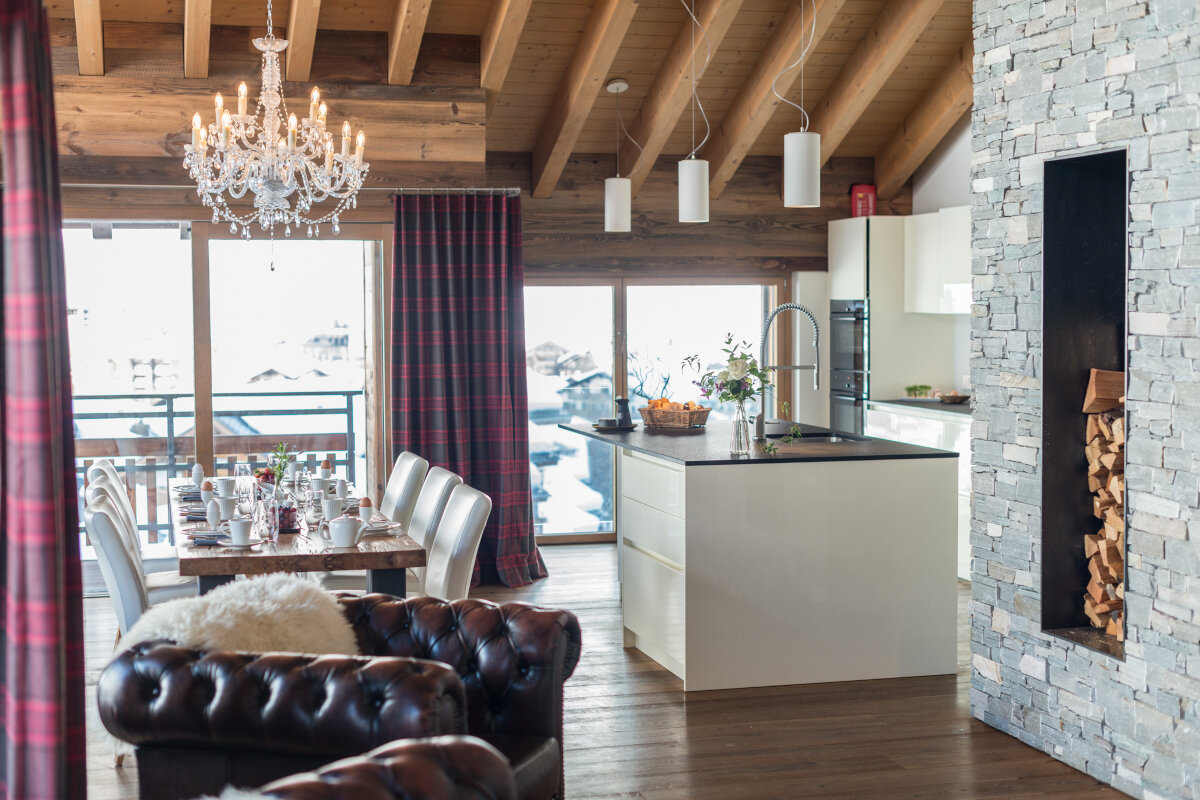 The lounge area at one end of the living space has comfortable sofas arranged round a low coffee table, from where you can take in the mountain views or watch something on the wall-mounted TV which has a cinema sound system. In the middle of the living space there is a fireplace with a stone-clad chimney breast, faced by a pair of leather-upholstered club armchairs.